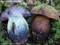 Suillellus luridus var. erythroteron a la chair violette dans le haut du stipe, rouge cerise ailleurs et le réseau rouge vif.
