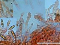 Cheilocystides fusiformes à clavées avec excroissances noduleuses au sommet, pigmentées de brun, 30-50 x 6-13 µm.