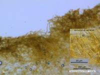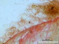 Cuticule trichodermique faite d'hyphes enchevêtrées non bouclées, pigmentées de brun, de 4-7 µm de large