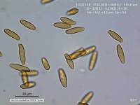 Spores fusiformes, lisses, brun jaune, guttulées, 13-18 x 4,5 µm. Sporée brun rouge à reflets olive.