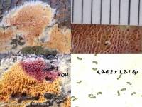 Cylindriques, allantoïdes, lisses, hyalines, en partie guttulées, 6-7 x 2-2,3 µm. Basides étroitement clavées, tétrasporiques, non bouclées. Pas de cystides. Monomitique : hyphes à parois minces ou épaissies, larges, cloisonnées, non bouclées et partiellement incrustées d'une masse amorphe.