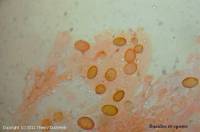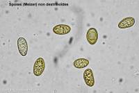 Spores ellipsoïdes,lisses, brun clair, à granulations, à paroi épaisse, 8-13µm X 5-8µm, cyanophiles, non amyloïdes, non dextrinoîdes.