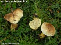 Tricholoma hemisulphureum pousse dans la microsylve alpine, possède un chapeau blanc sale au centre brun, le haut du pied concolore au chapeau et le pied jaune sale.