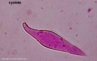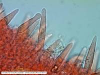 Cheilo et pleurocystides fusiformes, à paroi épaissie, partiellement incrustées au sommet, parfois à contenu granuleux.