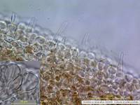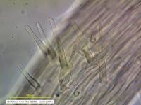Cuticule hyméniforme à cellules piriformes brunâtres à paroi épaissie non bouclées, mêlées à des dermatocystides étroitement fiusiformes.