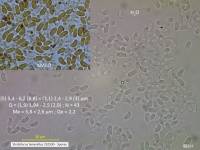 Spores 5-6 × 2,5-3,5 µm, elliptiques, lisses, hyalines, légèrement arquées, I-. Sporée crème blanchâtre.