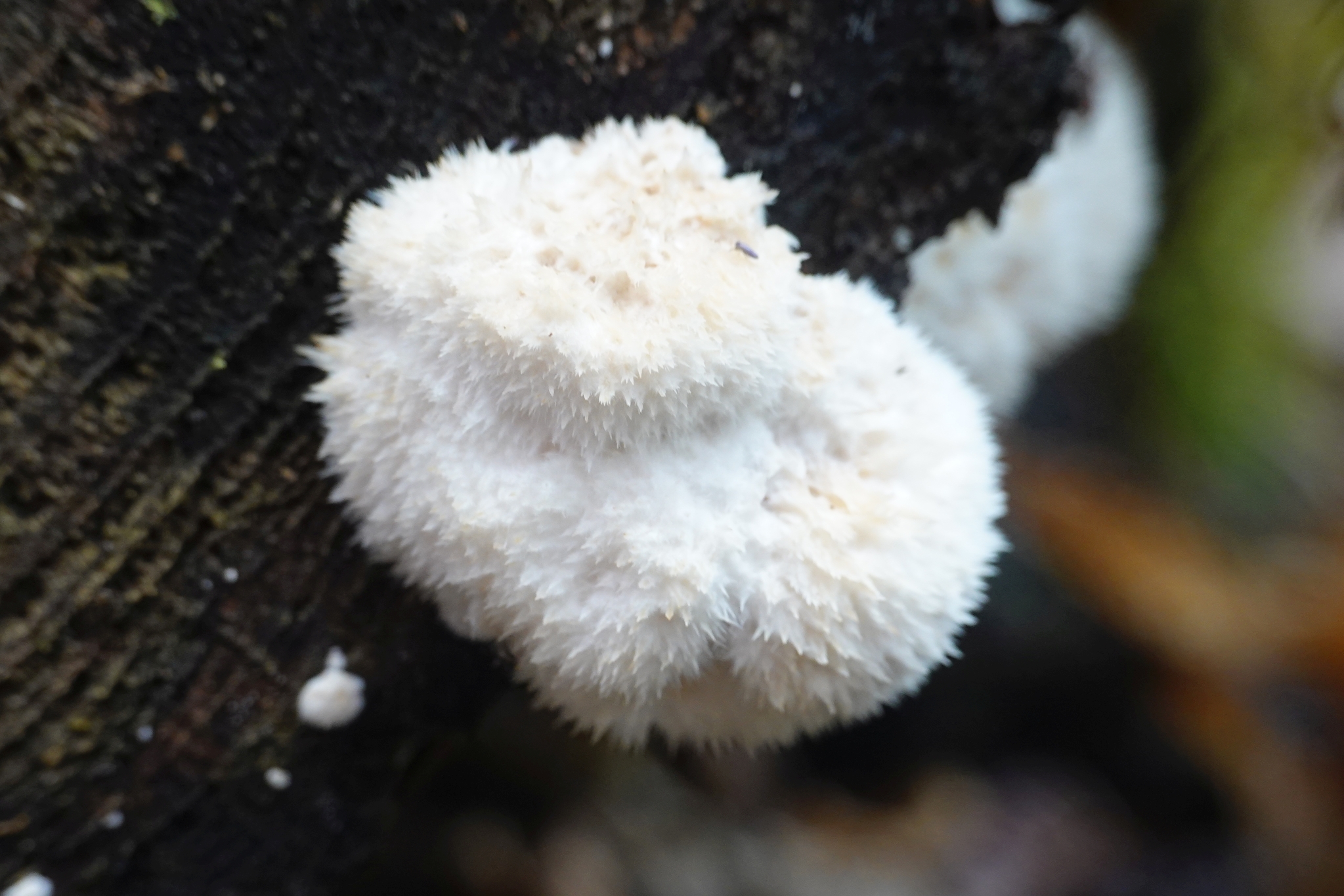 Bonjour. Connaissez-vous ce champignon blanc duveteux ? Sous-bois de feuillus. Groupe de champignon sur un chataigner mort (coupé). Merci d'avance. FL.