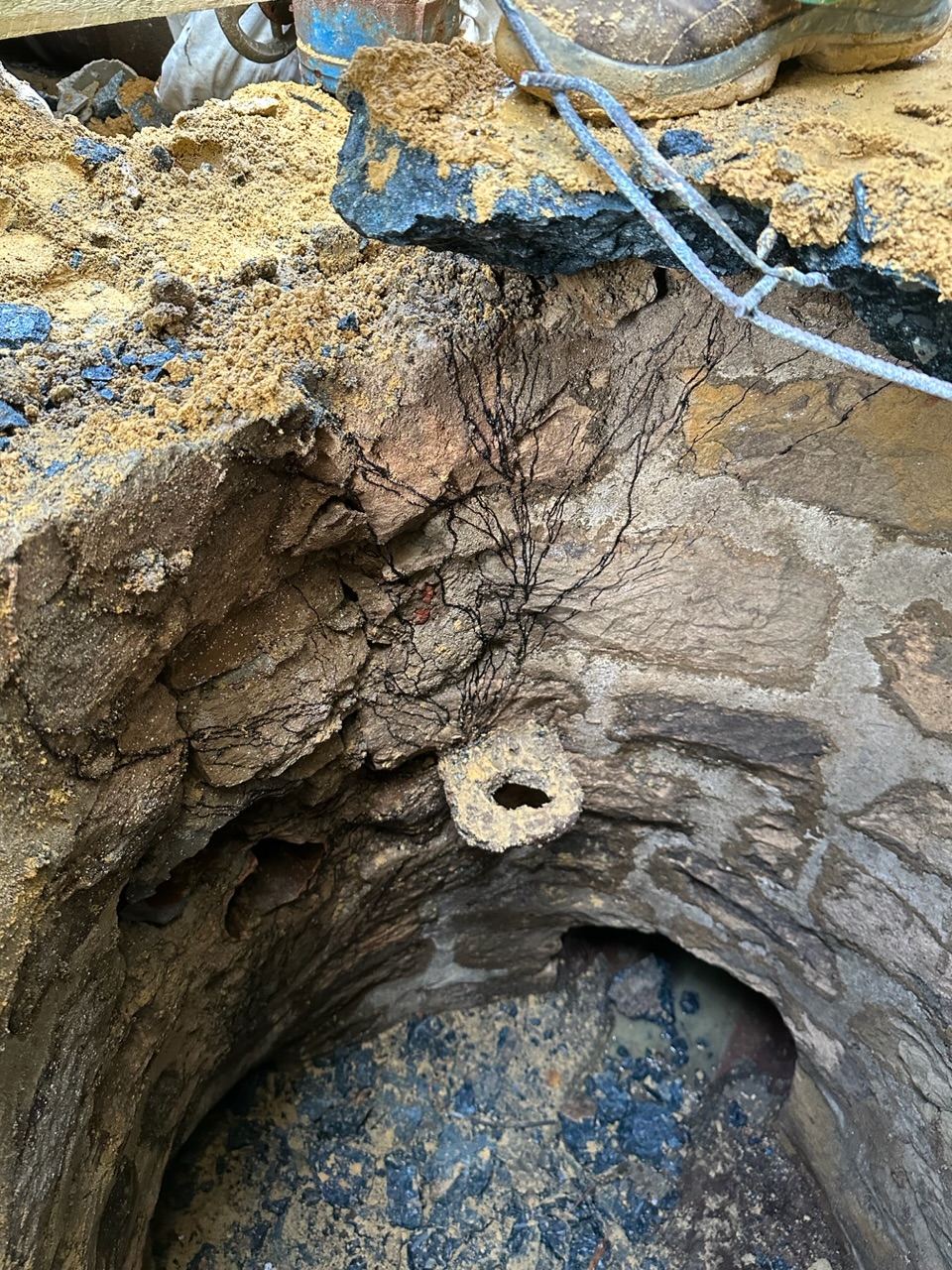 Difficile à croire que cela vienne de bois ou d’un arbre, étant donner que cela se situe en pleine ville et que le regard et enfuie sous la voirie et recouvert et scellé par une dalle de béton a +/- 1,20 à 1,50 sous terres, la structure au dessus de la dalle était uniquement composée de remplis en pierre et sable de carrière et en enrobés pour la partie supérieure
