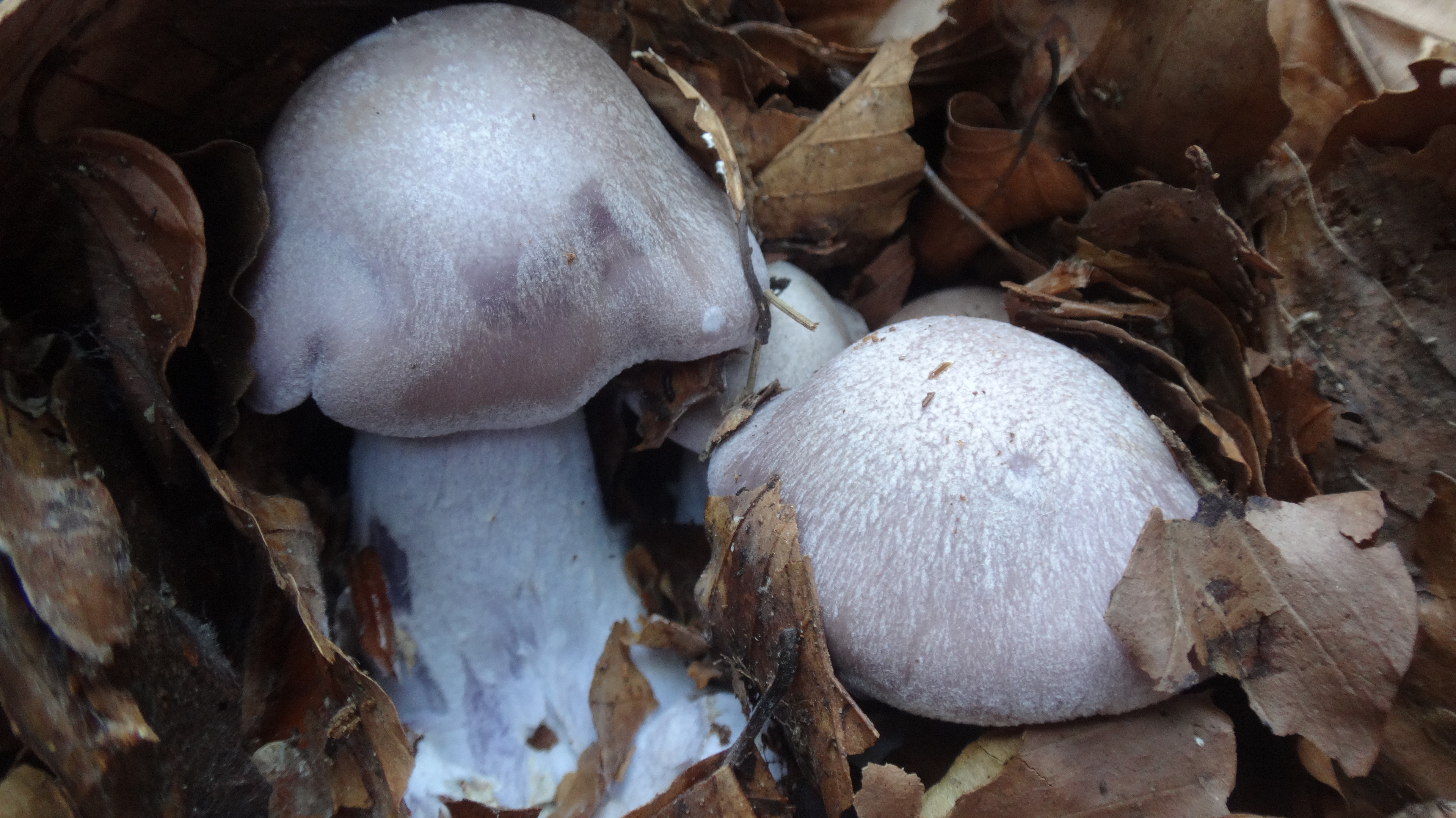Pour les pieds bleus voici deux photos. Ils sont mauves, les lamelles plus foncées et le pied un peu bleuté. Odeur très agréable. Ils font 5 à 8 cm environ et poussaient sous les hêtres, dans la litière.