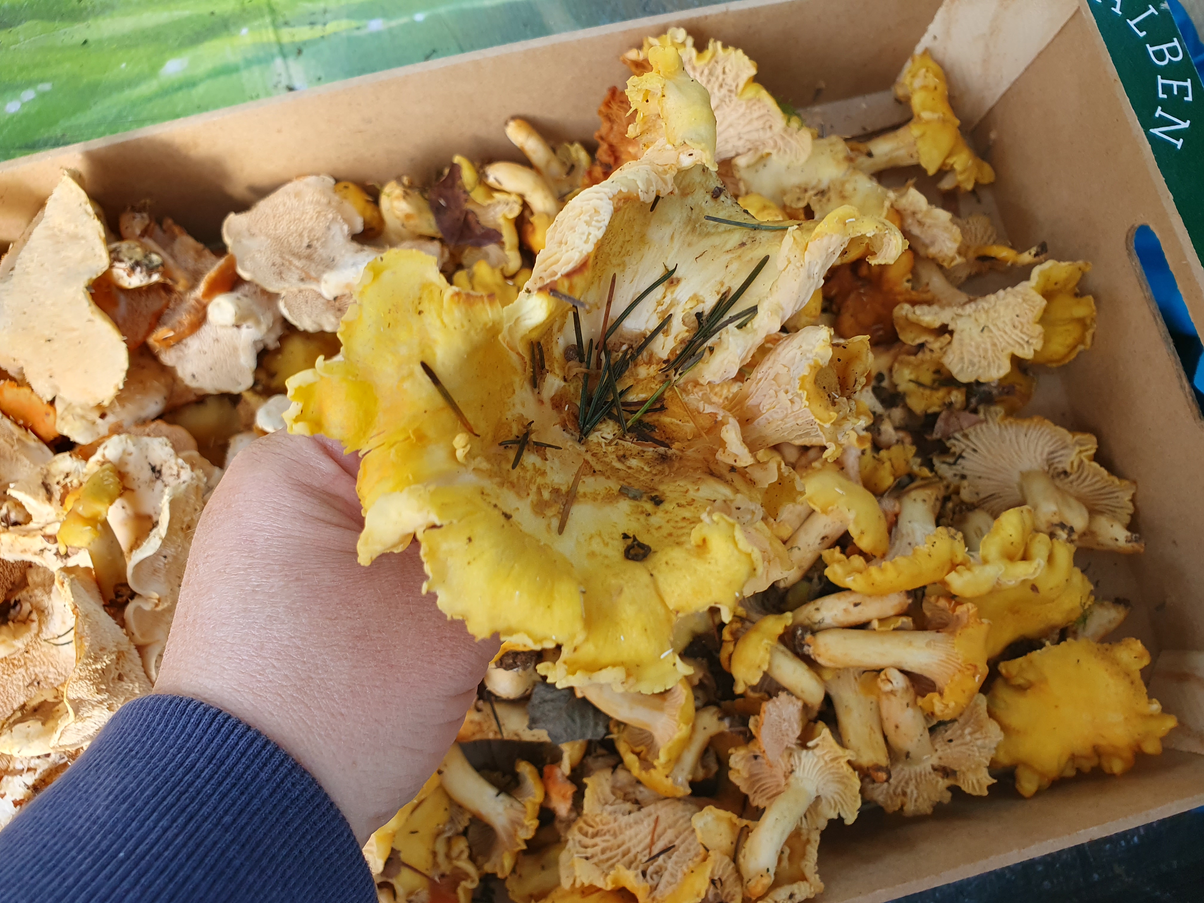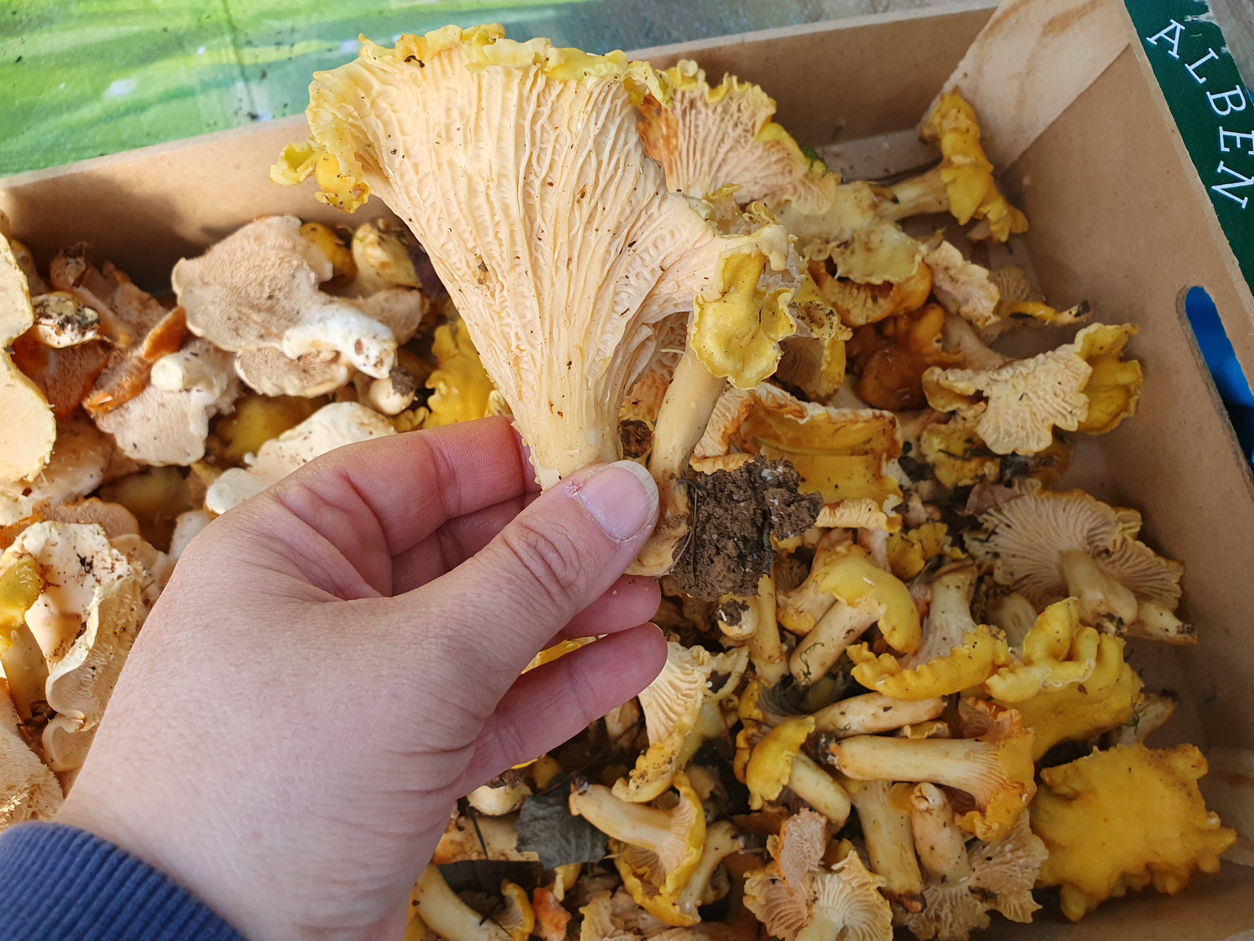 Je pense à Cantharellus cibarius (Girolle) et Hydnum repandum (Pied de mouton).
