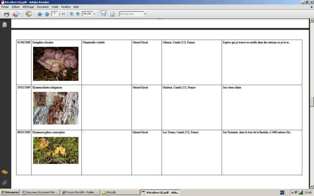 On en apprend tous les jours. Je viens de jeter un œil sur la base de données Mycodb et de me rendre compte que nous disposons d’un fichier PDF de nos récoltes. Nous pouvons du coup l’imprimer avec nos photographies. Moi qui suis loin de maitriser parfaitement l’informatique, c’est un plus non négligeable. S’il me fallait faire la même chose sous Word ou sous PDF cela représenterait un travail colossal.