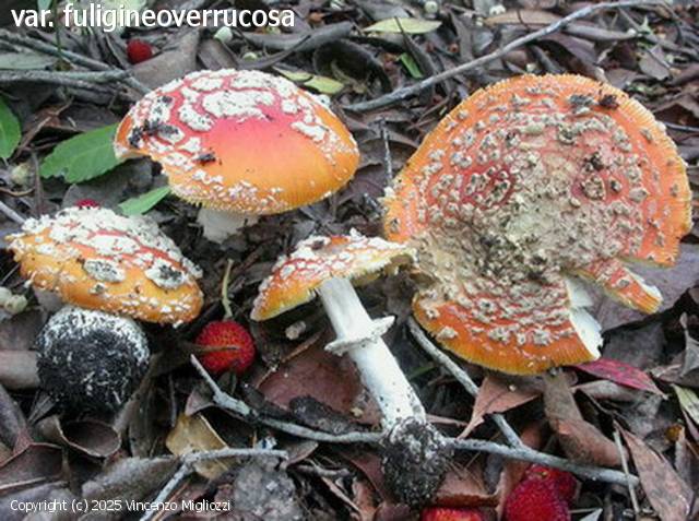 Amanita muscaria var. fuligineoverrucosa dont les flocons se tachent de brun-gris avec l'âge et possède une préférence écologique pour les Salicaceae.