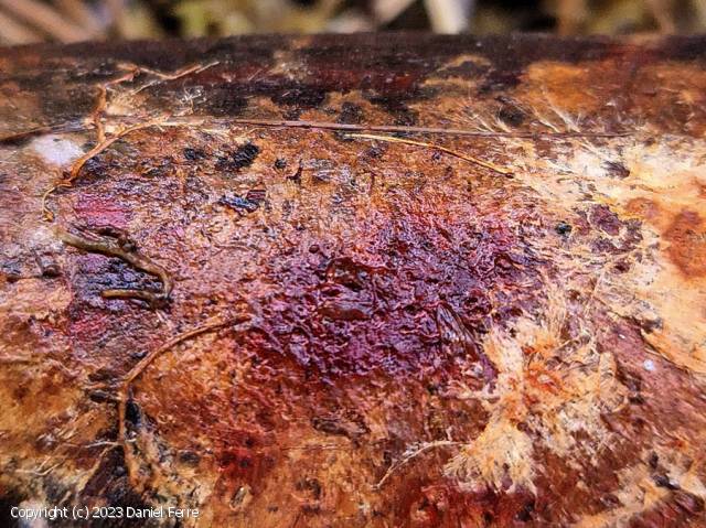 Espèce caractérisée par sa surface rouge, ou tachée de rouge, ses rhizomorphes et la coloration du bois attaqué.