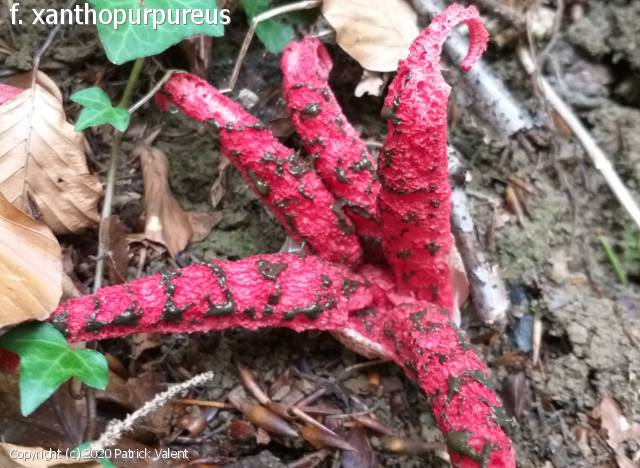 Aseroe rubra est stipité, a des branches dichotomiques alignées sur le plan horizontal, peu courbés, un trou à son centre.