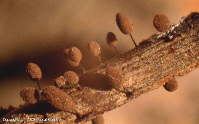 Capillitium brun foncé, rameaux primaires perpendiculaires à la columelle, filaments ramifiés, flexueux, bouclés en surface sans extrémités libres.