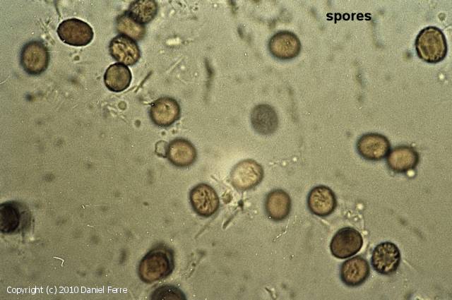 Subglobuleuses, lisses, 6-5 x 5-8 µm. Basides à 2-4 stérigmates, 30-45 x 5-6 µm. Gléocystides nombreuses, subcylindriques, parfois septées, à contenu granuleux. SV +, 30-150 x 7-12 µm. Système monomitique: Hyphes basilaires à paroi épaisse, fauves, larges de 2-4 µm, courtement ramifiées passant dans la partie supérieure de la trame à des hyphes de type dichohyphides, subhyalines, larges de 1,5-3 µm, moins ramifiées terminées par des rameaux dendroïdes nombreux, à paroi épaissie, ramifiés dichotomiquement et aux extrémités aigues