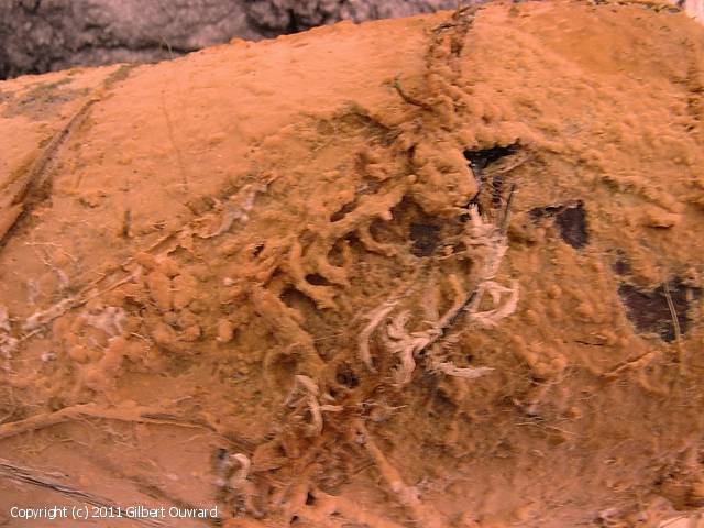 Subglobuleuses, lisses, 6-5 x 5-8 µm. Basides à 2-4 stérigmates, 30-45 x 5-6 µm. Gléocystides nombreuses, subcylindriques, parfois septées, à contenu granuleux. SV +, 30-150 x 7-12 µm. Système monomitique: Hyphes basilaires à paroi épaisse, fauves, larges de 2-4 µm, courtement ramifiées passant dans la partie supérieure de la trame à des hyphes de type dichohyphides, subhyalines, larges de 1,5-3 µm, moins ramifiées terminées par des rameaux dendroïdes nombreux, à paroi épaissie, ramifiés dichotomiquement et aux extrémités aigues