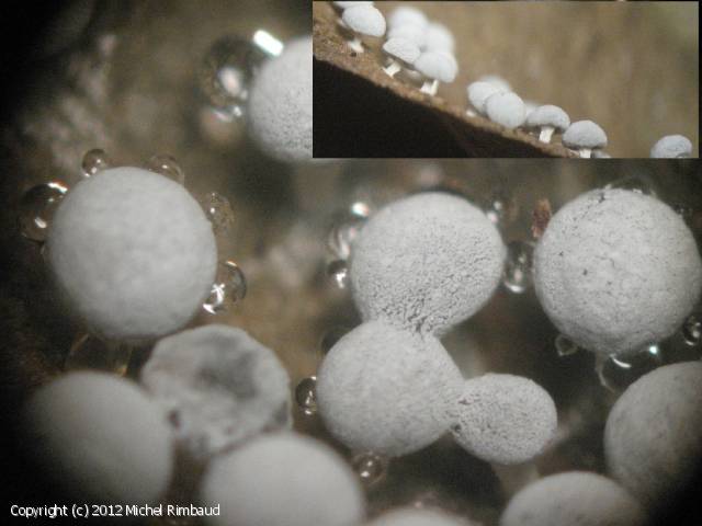 Spores claires, finement verruqueuses, avec des groupes de verrues plus foncées, mesurant de 8 à 11μm de diamètre.