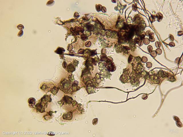 Spores claires de (7-) 8-10 (-11)µm de diamètre, verruqueuses, avec des groupes de verrues plus foncées.
