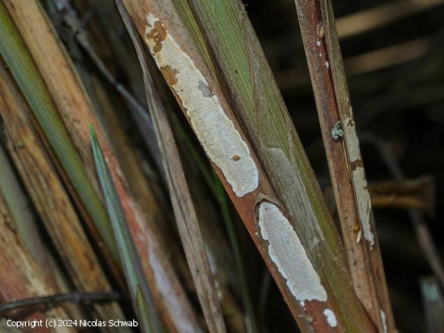 Fructification résupinée, finement ponctuée, blanchâtre à crème. Spores 22-
