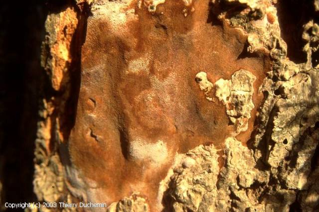 Consistance ligneuse et dure, brun doré à brun foncé, jusqu'à 2 mm d'épaisseur.
