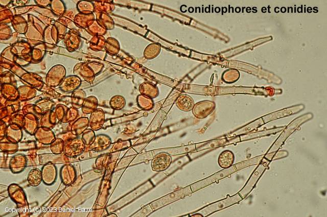 (Conidies) ovales,à parois épaisses,hyalines 15-18 x 11-13µm. Conidiospores cloisonnées transversalement,hyalins, en forme d'hyphes larges. Les conidies sont produites au niveau des 5-7 derniers articles. A cet endroit persiste une cicatrice sous forme d'une petite cicatrice cylindrique.