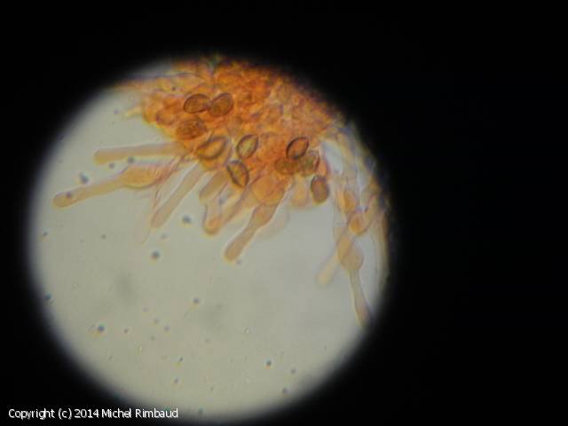 Spores amygdaliformes, à paroi mince, plus ou moins finement verruqueuses, jaune ochracées, fortement dextrinoïdes, 10-14 x 6-8,5 µm.