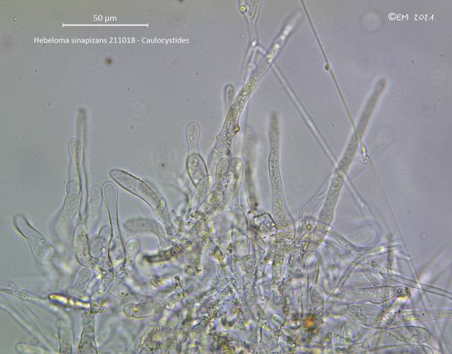 Cheilocystides cylindriques à base souvent irrégulièrement renflée et à extrémité légèrement capitée, 35-70 x 7-12 µm.