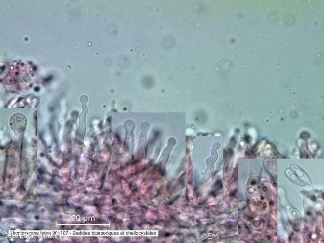 Cheilocystides fusiformes à cylindriques, 15-45 x 4,5-6 µm.