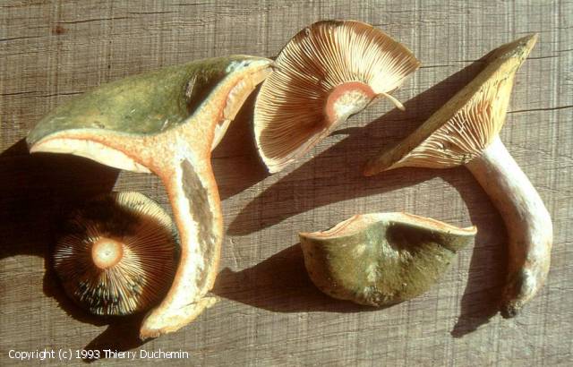 Chapeau très verdissant. Stipe peu scrobiculé. Chair sanguine en quelques minutes. Lait virant au rouge vineux après 2-10 minutes puis verdissant.