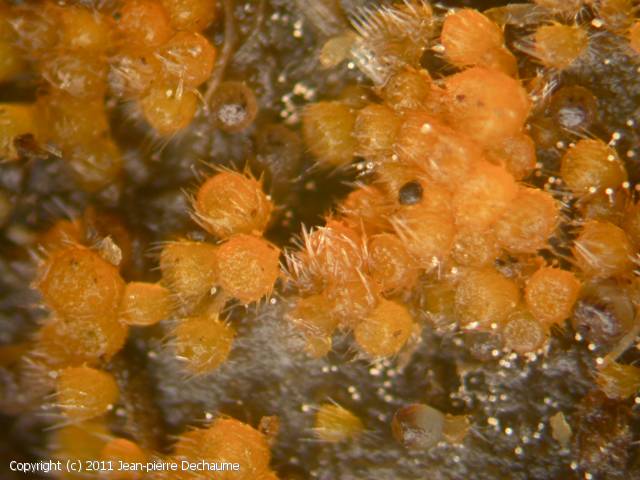 - Description :Réceptacle 0,4-0,8 cm, acétabulé à l'état jeune, puis rond et aplani, jaune ou jaune roussâtre ou orange-jaune, couvert extérieurement ainsi que sur la marge, de poils mous, concolores ou un peu fauvâtres. Repose directement sur le substrat.
