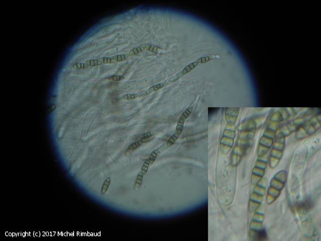 Cylindriques, lisses,brunâtres avec rétrécissement au niveau des 3 cloisons, avec parfois de fines guttules 15-18 x 4,5-5,5µm.