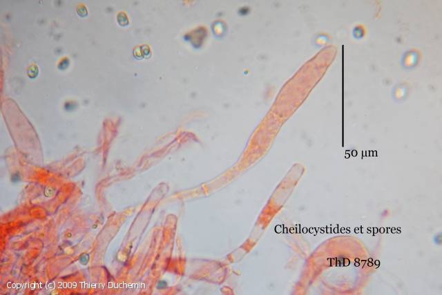 Cheilocystides cylindriques, plus ou moins clavées ou lagéniformes 22-90 x 8-20 µm.