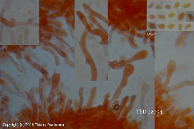 Elliptiques, lisses, hyalines, guttulées, 4-5 x 2-2,5 µm, J-. Basides clavées, tétrasporiques. Pas de cystide.