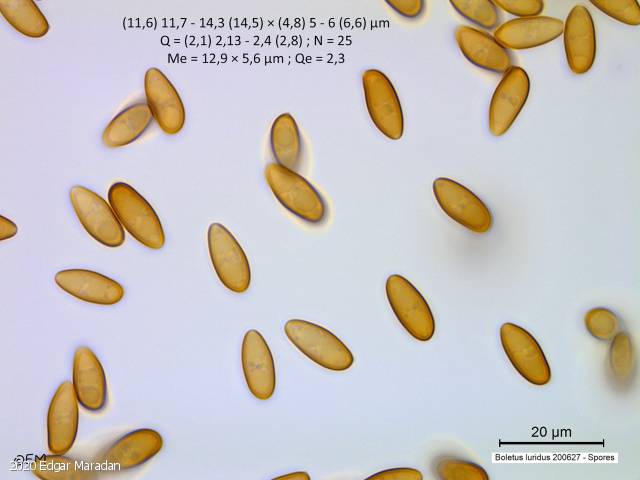 Mesurant 11,5-16 × 5-7,5 µm, elliptiques à fusiformes, lisses.