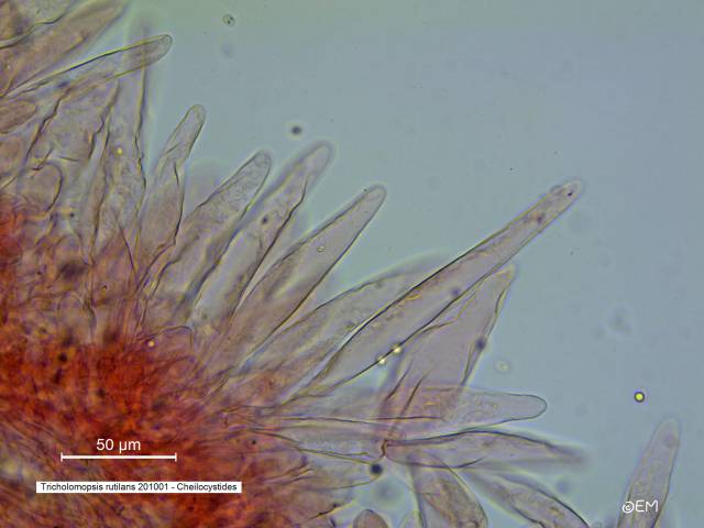 Cheilocystides clavées à fusiformes, 25-100 x 8-18 µm. Pleurocystides absentes.