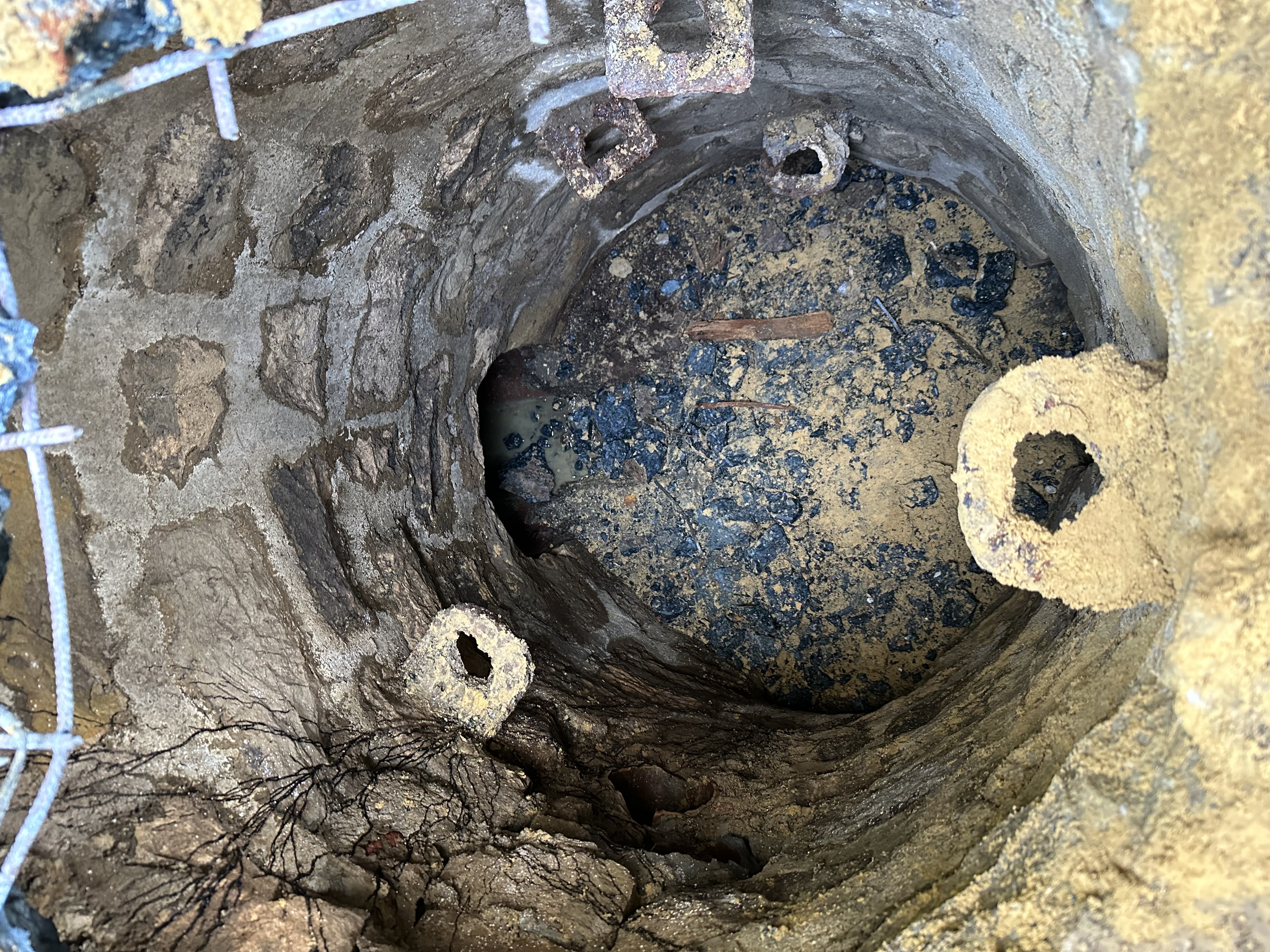 Difficile à croire que cela vienne de bois ou d’un arbre, étant donner que cela se situe en pleine ville et que le regard et enfuie sous la voirie et recouvert et scellé par une dalle de béton a +/- 1,20 à 1,50 sous terres, la structure au dessus de la dalle était uniquement composée de remplis en pierre et sable de carrière et en enrobés pour la partie supérieure