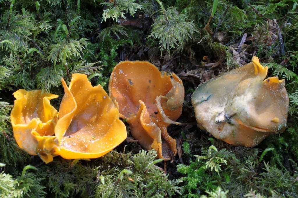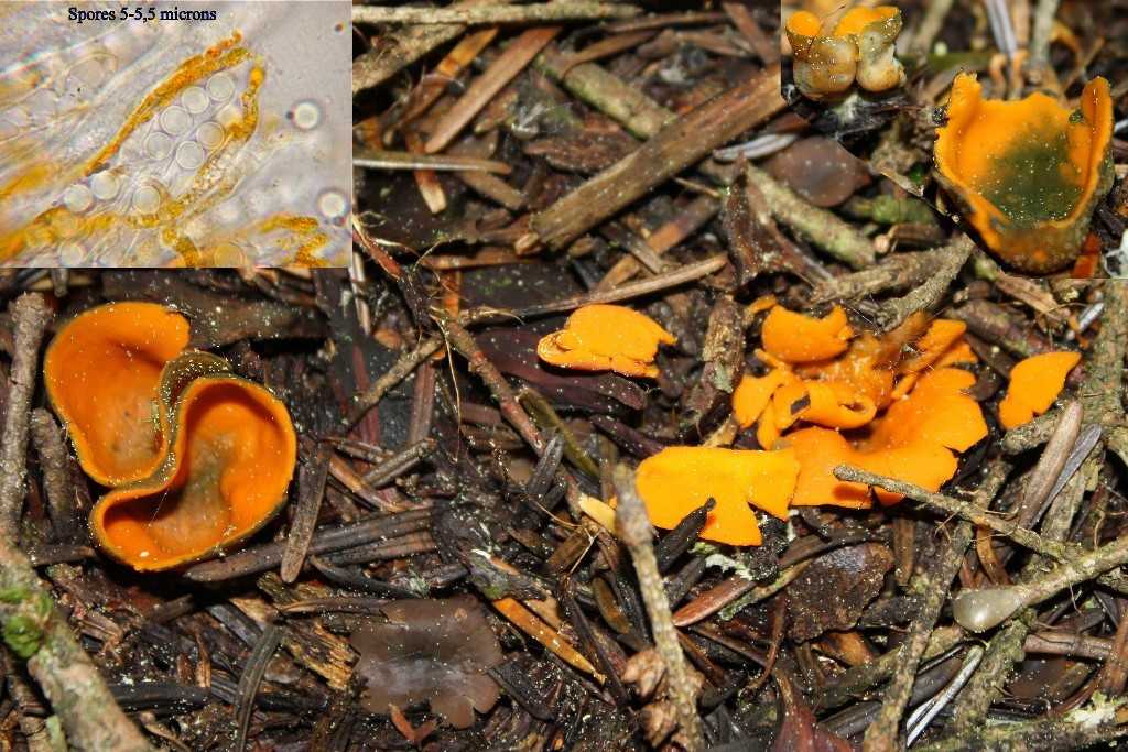Voici un bien joli Asco orange dont l’hymenium se tinte de vert en vieillissant. Il pousse par centaines en ce moment sous les Abies du Cantal. On le trouve beaucoup dans les aiguilles, mais encore plus dans la mousse. Comme chez les Suisses, il est toujours lié ici aux sapins vrais, je ne l’ai encore jamais rencontré dans un bois de feuillus. Le BK précise aussi qu’il est plutôt rare, ce qui n’est pas le cas ici, où il est fidèle à ses stations. On peut voir que Ciboria rufofusca lui tient compagnie, je l’ai également rencontré en très grand nombre, même s’il passe plus inaperçu.