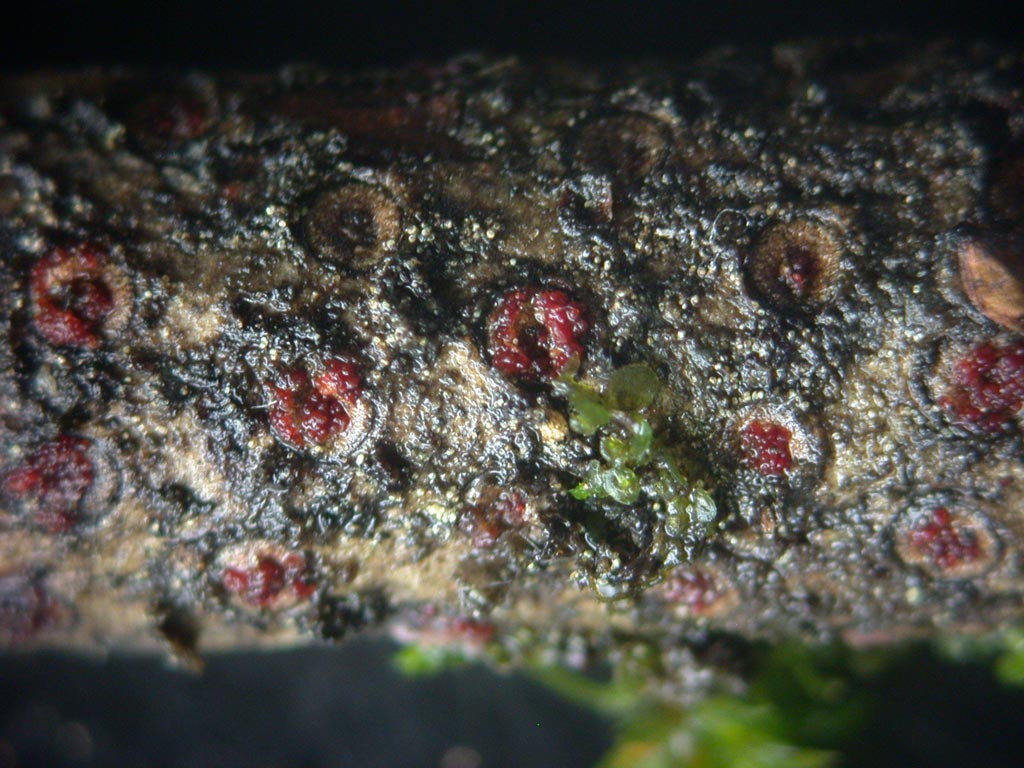 Même pas beaux, explosant l'écorce, des groupes de fructifications noires, en croissance, de quelques mm, élastiques à ne pas pouvoir les extraire, à ne pas se laisser écraser sous la lamelle, comme les tremelles, de jolies conidies en croissant dans une gélatine gris perle, pas d'asques, ni de vraies spores. La forme mature est rare ( suisses ), c'est