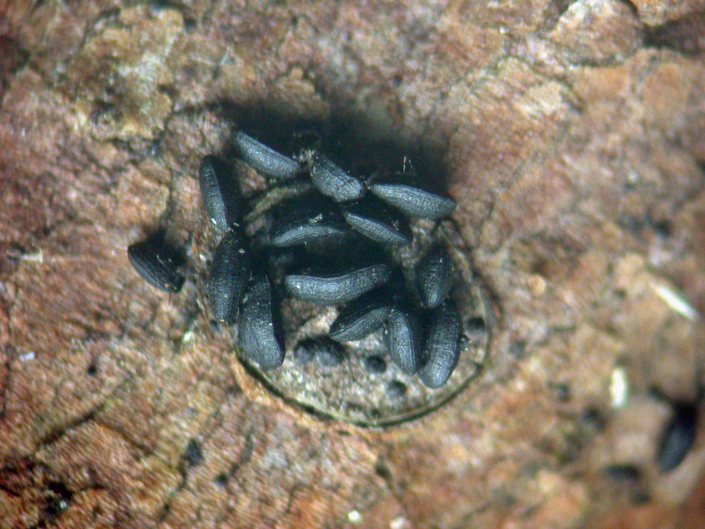 Lasiosphaeria strigosa ( boule poilue hérissée), sur bois mort de feuillu décortiqué, toujours en grand nombre, noir sous la pluie, puis brun rouillé par le sec. Un mm de diam. C'est un champignon mal interprété. J'ai choisi ce nom. Proche est