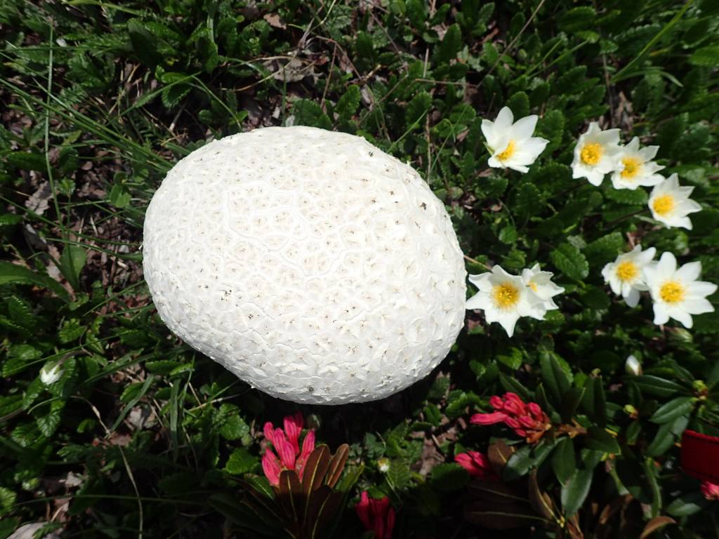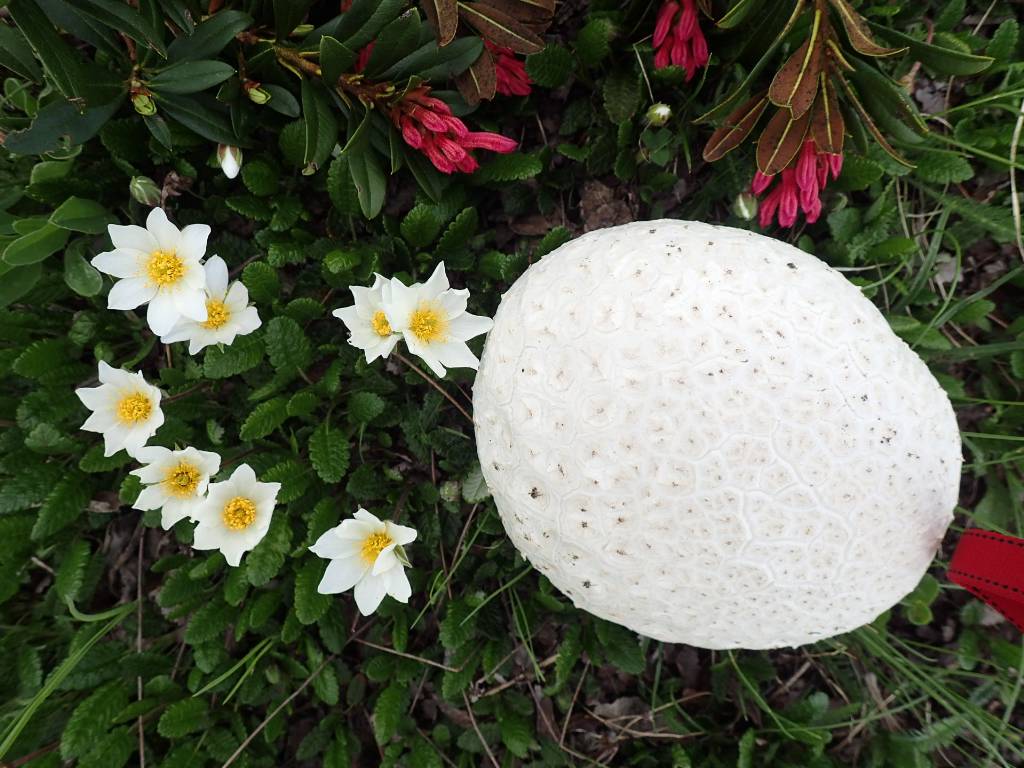 Récolté a 1800 m d'altitude par Danielle au milieu des Dryas et rhododendron, J'ai tout de suite pensé à Calvatia cretacea. Eh bien non, les spores sont tout à fait lisses ce qui en fait, je pense, simplement Calvatia utriformis signalé en zone alpine.