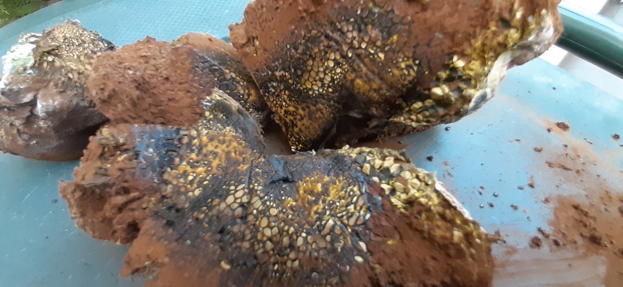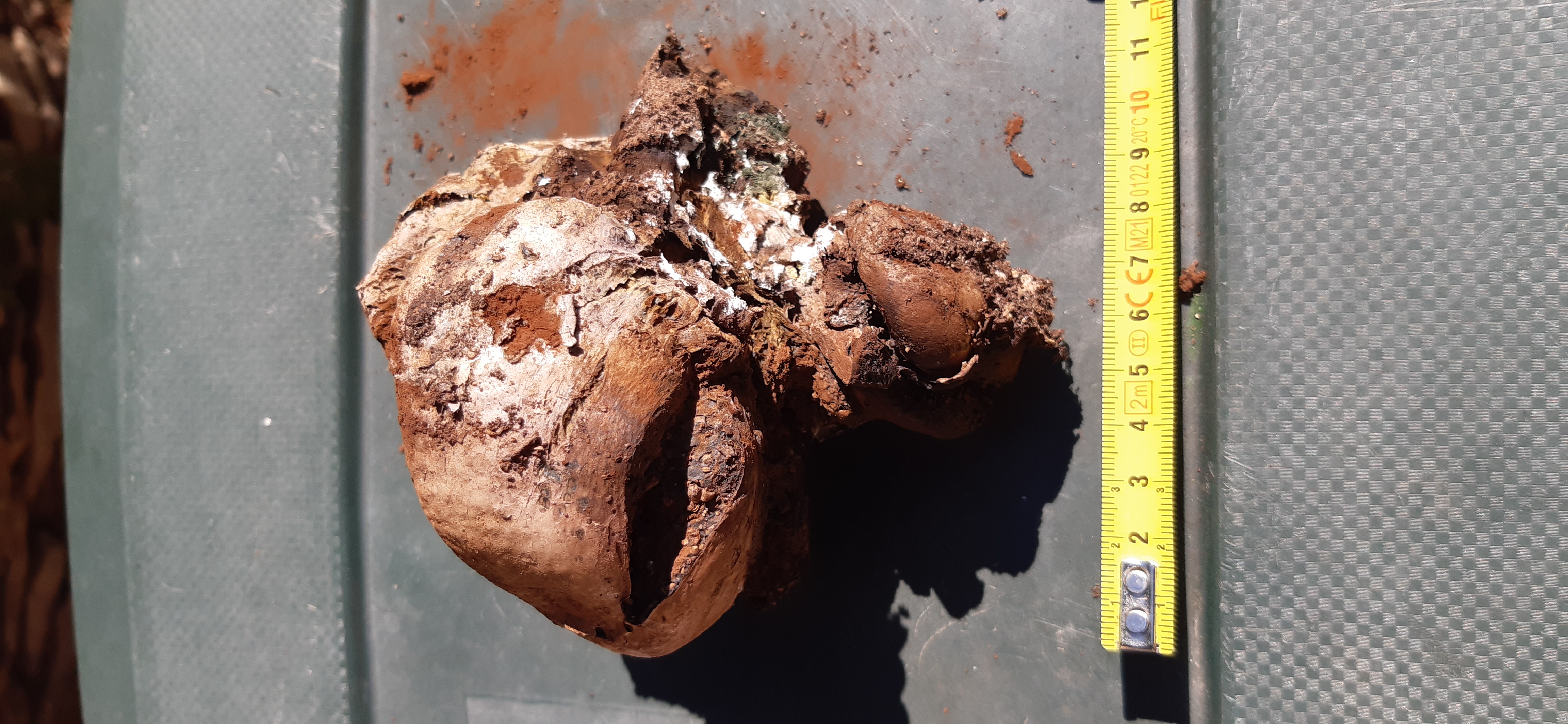 Bonjour, je soumet à la sagacité des usager de ce forum ce champignon qui m'est inconnu. Champignon environ 10cm il a poussé en partie sous une dalle de calcaire qu'il a soulevé de quelques cm , le calcaire a pris une teinte violacée au contact du champignon. Il a poussé sous un chêne-vert (lien avec les racines ?). Il était +/- "ouvert" avec un aspect interne plein d'une poudre brune; Pas d'odeur particulière.