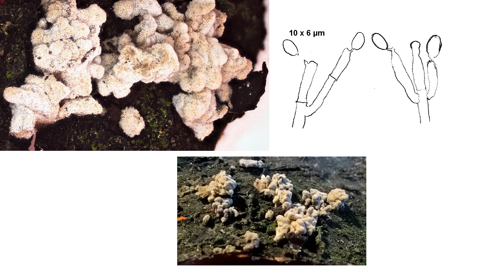 Bonjour, Je pense qu'il s'agit d'une forme imparfaite (anamorphe) d'ascomycète, se présentant sous forme de petites colonies duveteuses blanc crème (2 - 3 mm de haut) par groupes sur l'écorce de bois de cerisier coupé depuis plusieurs années. Au microscope, on voit des conidiophores lisses rappelant les Eurotiales, avec des spores lisses ovales de 10 x 6 µm environ (voir dessin à côté de la photo, désolé je ne peux pas photographier au microscope...). Pas de boucles détectées. Merci d'avance si vous avez une idée !