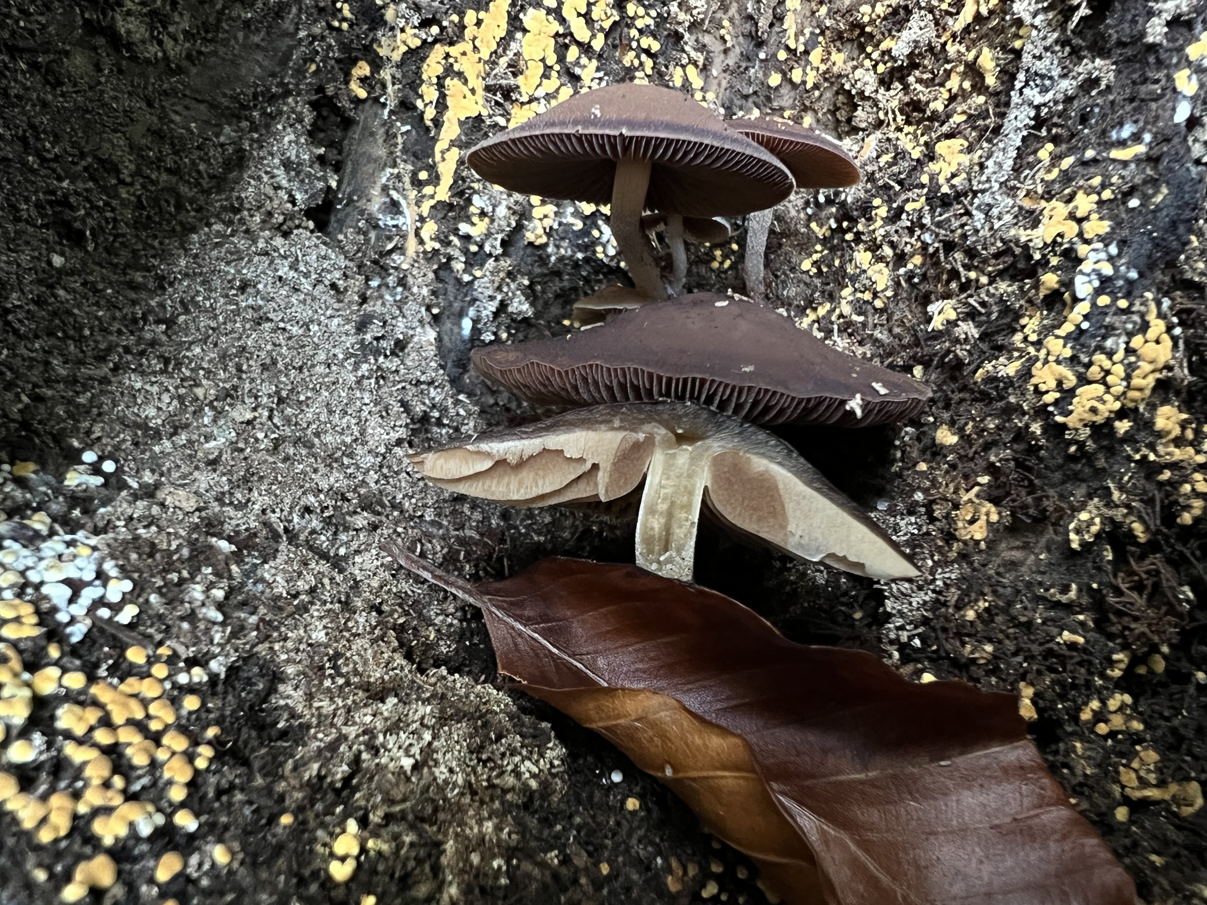 Bonjour, connaissez-vous ce champignon poussant sur une souche de hêtre (feuille jointe !) ? Même type d'implantation que la Volvaire soyeuse, mais les couleurs ne correspondent pas, ni le bulbe basal, inexistant ici (ou invisible). Le sporophore brun est ourlé de brun plus foncé en bordure, mais pas au centre. Lamelles concolores, stipe blanc chiné.