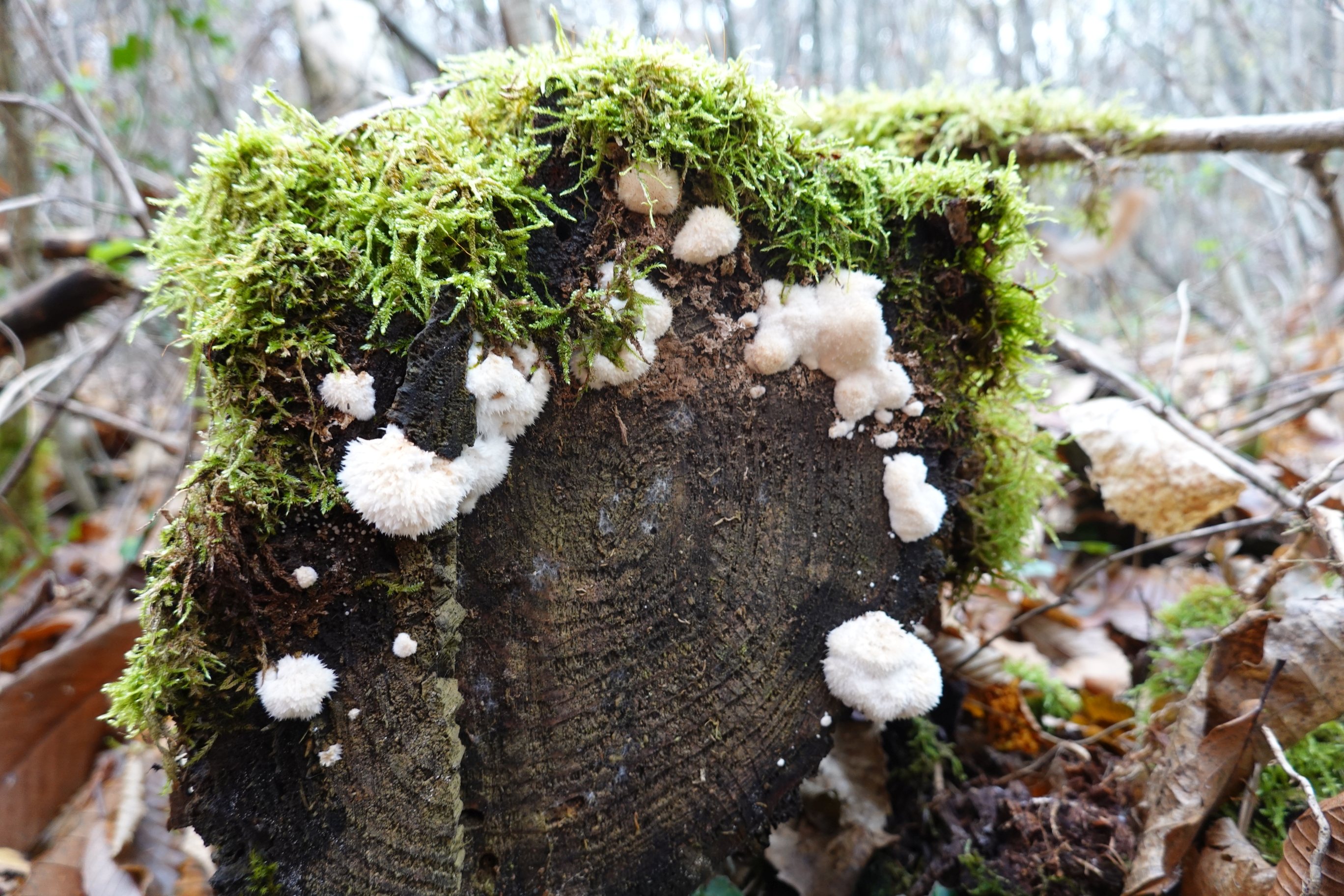 Bonjour. Connaissez-vous ce champignon blanc duveteux ? Sous-bois de feuillus. Groupe de champignon sur un chataigner mort (coupé). Merci d'avance. FL.