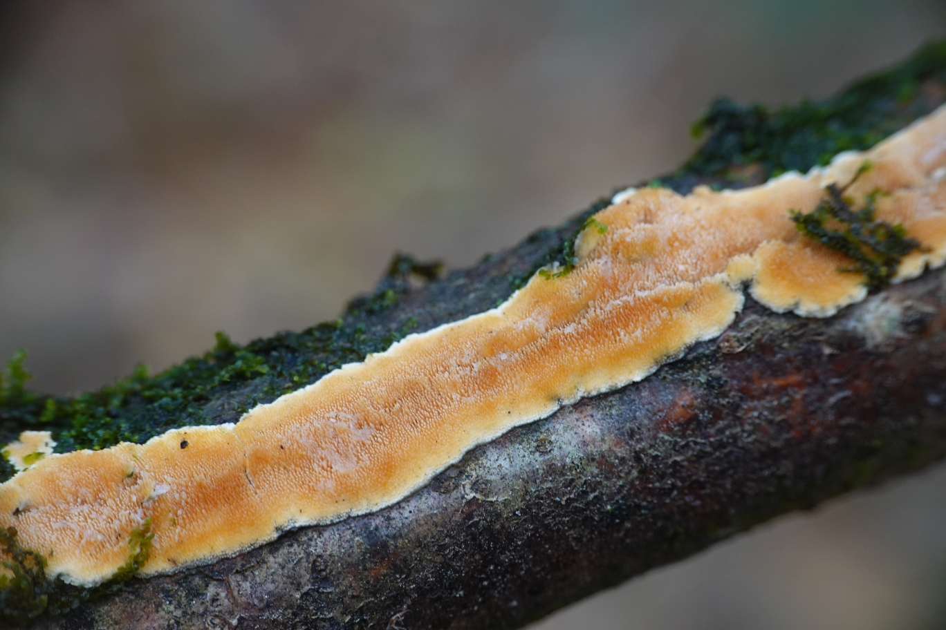 Pour être sûr qu'il s'agit bien d'un Stereum, il faut regarder attentivement l'hyménium. Si l'hyménium est parfaitement lisse, il s'agit en effet d'un Stereum mais la couleur ne me plaît pas. Il y a 2 champignons courants avec cette belle et même teinte saumonée: Junghuhnia nitida si l'hyménium est poré (pores très fins à peine visibles à l'oeil nu) Steccherinum ochraceum si l'hyménium est tapissé d'aiguillons eux aussi très denses et très petits (loupe).