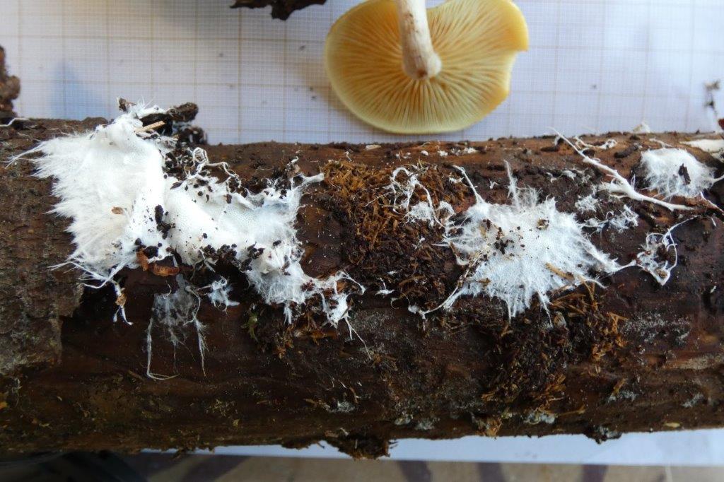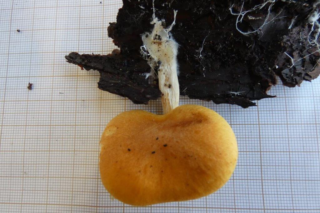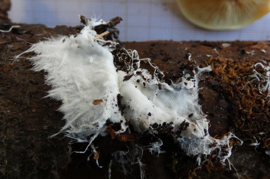 Bonjour Patrick. En effet il y a des "ficelles" qui tiennent au pied et qui sont certainement du mycellium. Mais il y a aussi un autre amas blanc, séparé, qui montre la formation de pores, et qui, comme le suggère Nommo, pourrait bien être Trechispora mollusca ou un avoisinant. Michel.
