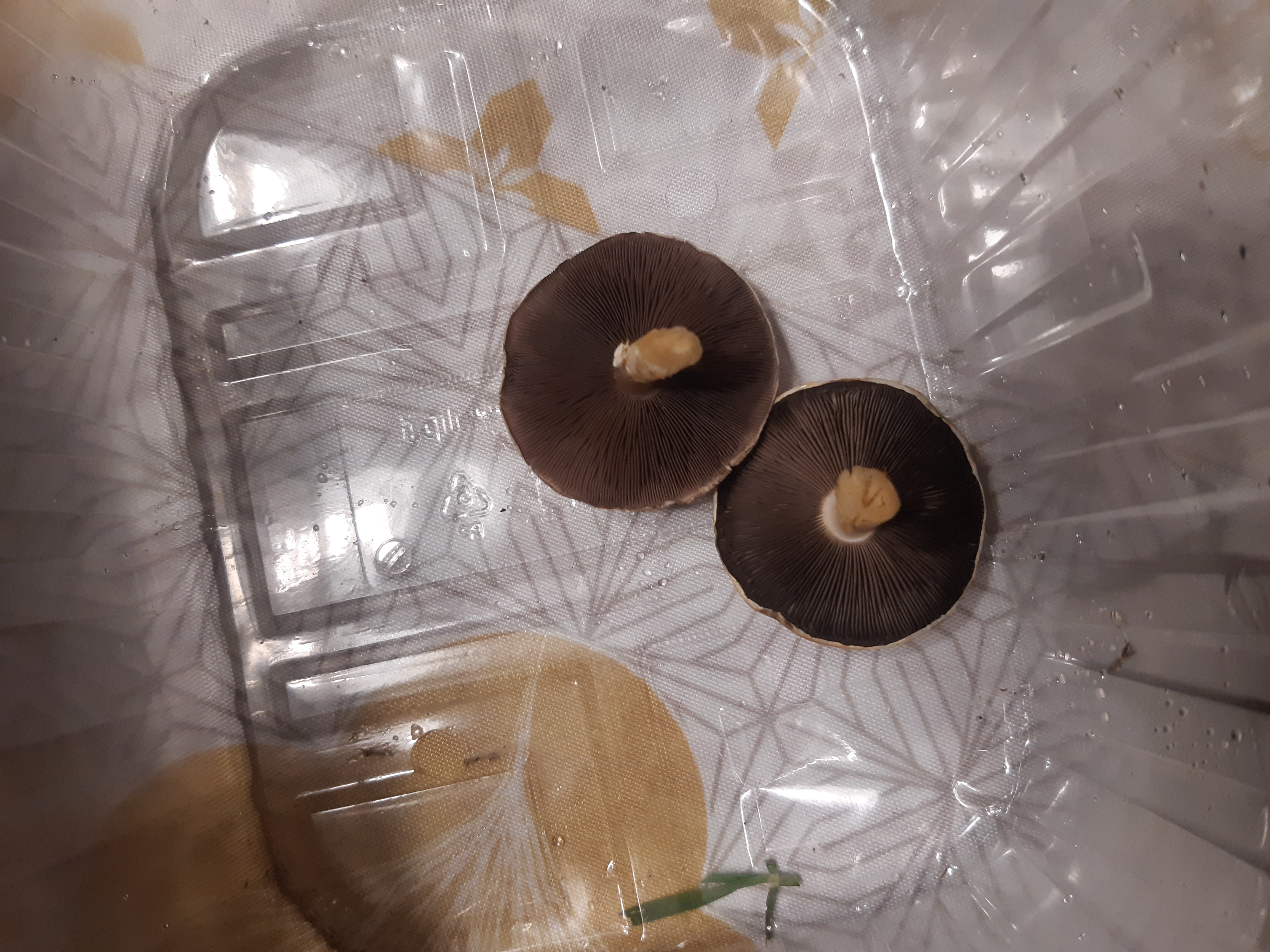 Je viens de ramasser quelques mousserons, et au milieu des mousserons j'ai trouvé deux champignons qui y ressemblaient comme deux gouttes d’eau vu de dessus, même taille, chapeau brun/beige avec un bosse au centre, pied filandreux et assez fin, mais qui présentent vu de dessous des lamelles très sombres (presque noires, légèrement violacées) et très serrées (et la sporée est également sombre). Ce champignon présente également une forte odeur d'amande amère. Je n’ai pas vu d’anneau sur le pied que j'ai coupé, et, comme le mousseron, les lamelles ne montent pas sur le pied.