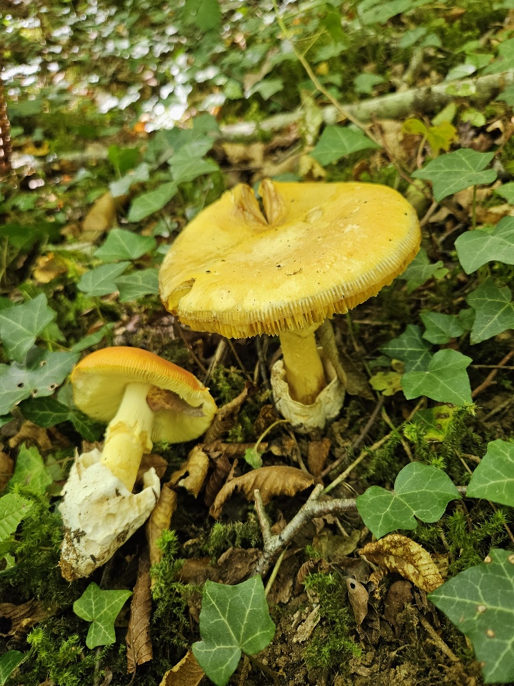 Sauf erreur, 4 amanita caesarea, trouvées à quelques mètres les unes des autres. Si ça ne se voit pas sur les photos, chaque champignon a ses lames jaunes et, toujours sauf erreur de ma part, les seules amanites à lames jaunes sont les oronges.