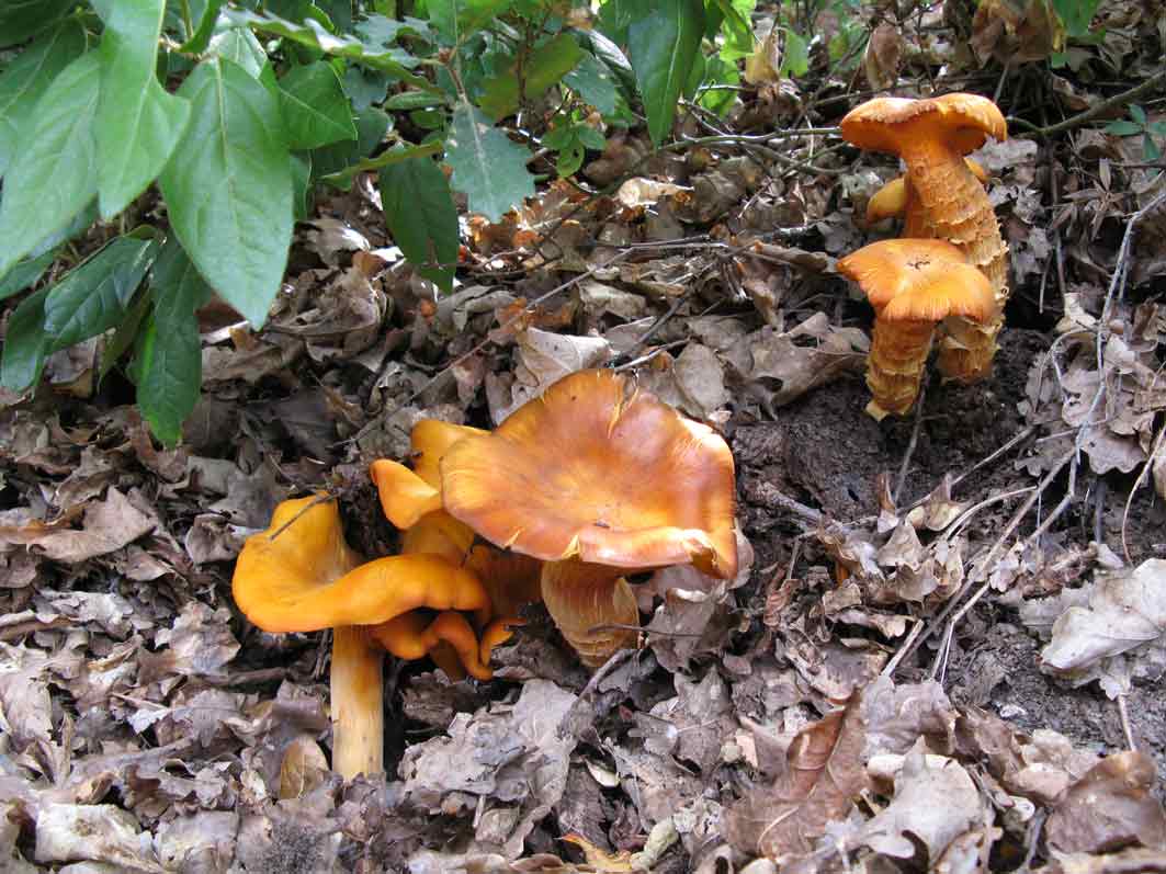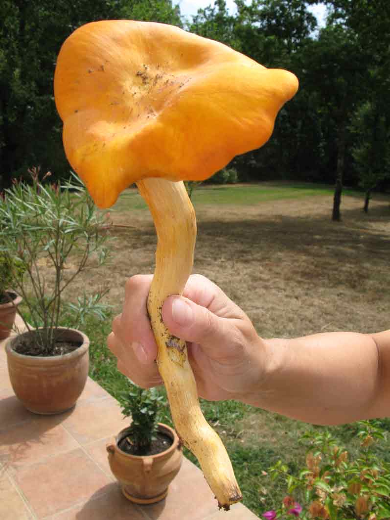 Jolie fausse girolle, qui serait plutôt une fausse-fausse girolle, Non pas Hygrophoropsis aurantiaca, la vraie fausse girolle, Mais Omphalotus illudens, ou son sosie du sud Omphalotus olearius, le "Clitocybe de l"olivier" un champignon toxique, que l'on trouve en touffes en général. Il figure sur le site Mycodb, sous les 2 formes. Il colore les doigts en orange, et dans l'obscurité, ses lames sont luminescentes ( il faut d'abord bien s'habituer au noir pour que ce soit perceptible...) Jeune, tant qu'il est petit, la confusion avec des girolles est possible, en tout cas dans ma région ( le Morvan ), où on peut quelquefois voir les 2 espèces côte à côte en été. C'est une espèce assez rare, mais que l'on voit à peu près tous les ans, toujours chez moi. Il serait intéressant de savoir si elle est régulièrement répartie en France. Tes photos sont très claires. Bravo jean pierre